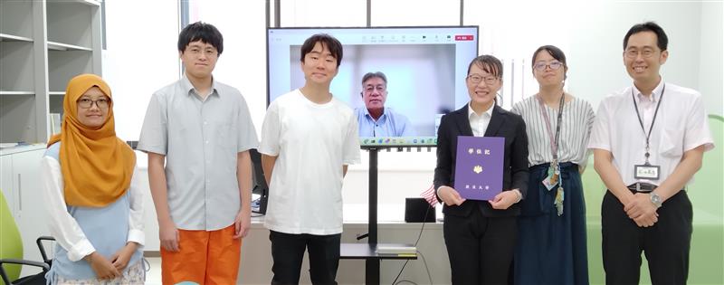 写真は、鈴木教授(一番右)とアズアン学長(右から2番目)、ヤティマ副学長(右から5番目)、そして学生(左2名)との懇談の様子です。
